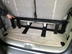 ベッドキットは100キロの荷重をかけても耐久力には問題ございませんが、お客様の中にはボードのたわみを気にされる方がいらっしまして、このようにワンタッチで取り付けられる補強バーを用意いたしました。